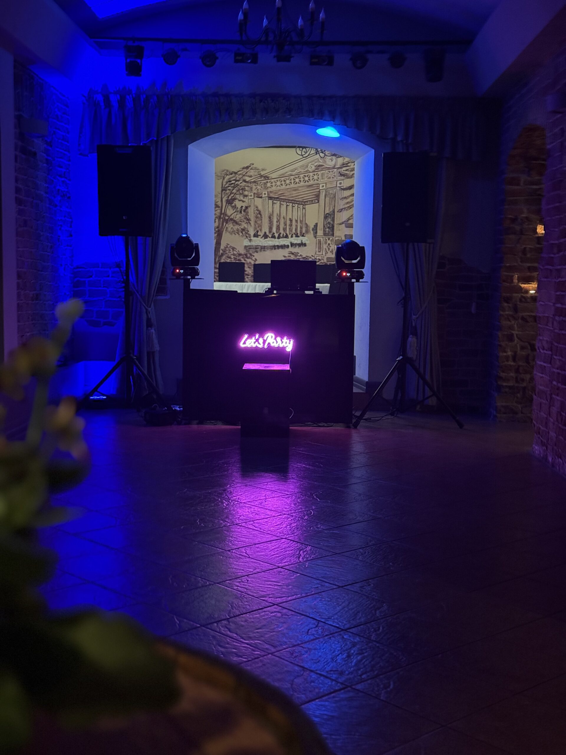 Profesjonalne nagłośnienie LD Systems & HK Audio oraz oświetlenie dostosowane do części tanecznej sali (przy użyciu ruchomych głów oraz innych systemów oświetleniowych LED), wytwórnica lekkiego dymu.